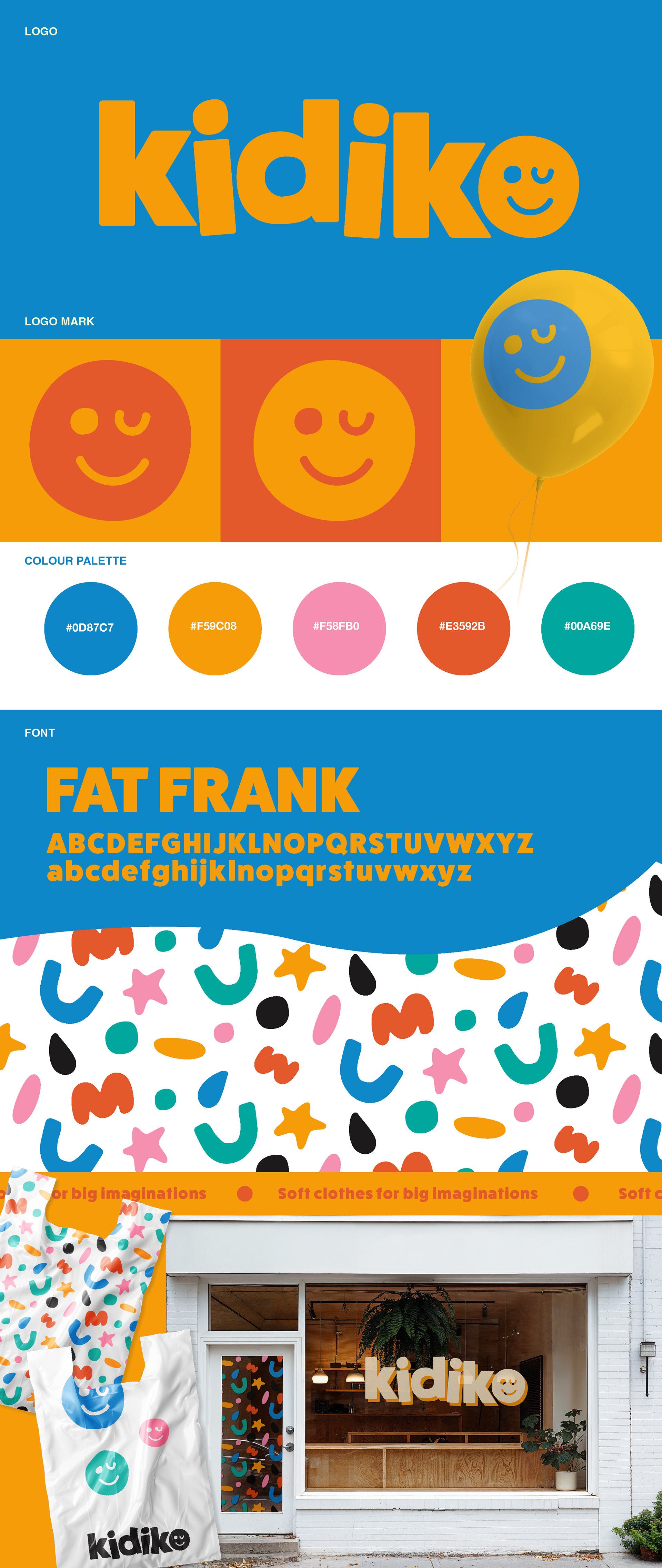 Kidiko is a playful kids’ clothing brand designed with comfort and inclusivity at its heart. The collection focuses on soft, seam-free garments made especially for children with sensory sensitivities, allowing them to move, play, and explore without distraction or discomfort. The brand identity mirrors that same sense of ease, colourful, round, and joyfully simple. From its bright palette to its soft, bouncy typography, every design element is made to feel welcoming, comforting, and full of personality, just like the clothes themselves.