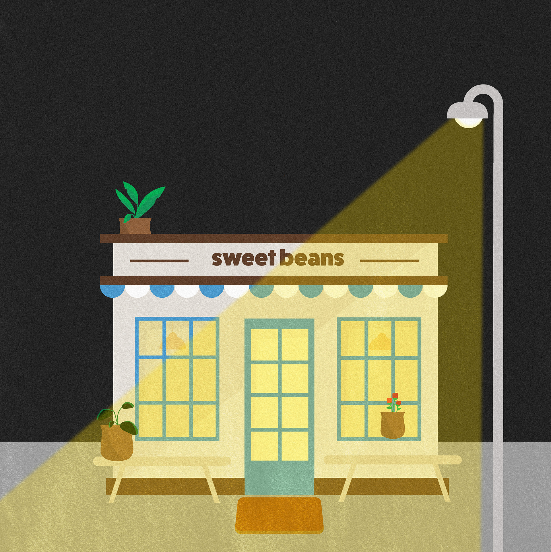 This work-in-progress depicts a cozy town of cafes and local businesses, entirely created in Adobe Illustrator. The goal is to evoke warmth and charm, with glowing windows that invite passersby to imagine wholesome, lively moments happening inside. Every detail is designed to create a welcoming, nostalgic atmosphere that feels both vibrant and comforting.